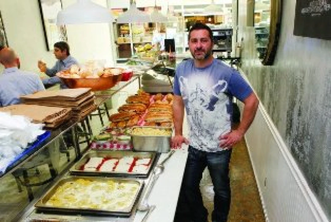 The lawyers stop for lunch, the laborers stop for lunch, and, at certain times of day, folks jam up the hallway like so many airplanes on the runway. "I'm no restaurateur by any means," says Frank Ambrosio, who opened the café in February and remains humble about his ambitions. "I grew up with good food."