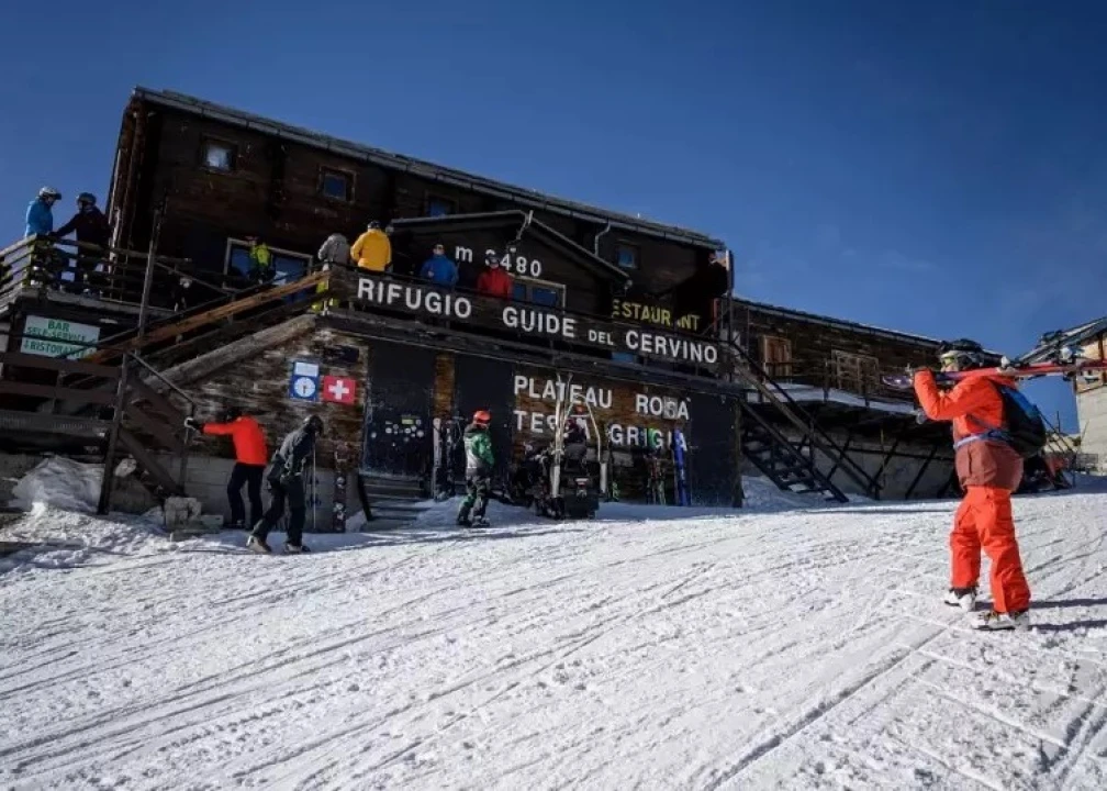 But the retreat of the Theodul Glacier means the watershed has crept towards the Rifugio Guide del Cervino, a refuge for visitors near the 3,480-metre Testa Grigia peak. Now it is gradually sweeping underneath the building. Frederic, a 59-year-old tourist, opens the narrow wooden door to enter the refuge's restaurant, the light flooding in from outside.