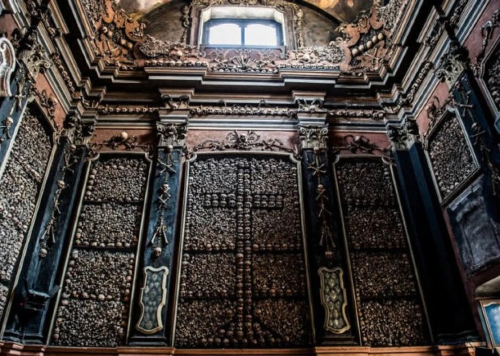 “Three hundred meters from the Duomo, the walls of the church are not built in stone but rather in human skulls. A sacred ossuary, an ossified sacrarium. A baroque church, a double howitzer hidden in the shadow of the cathedral. The skulls watch you, walled dead.”