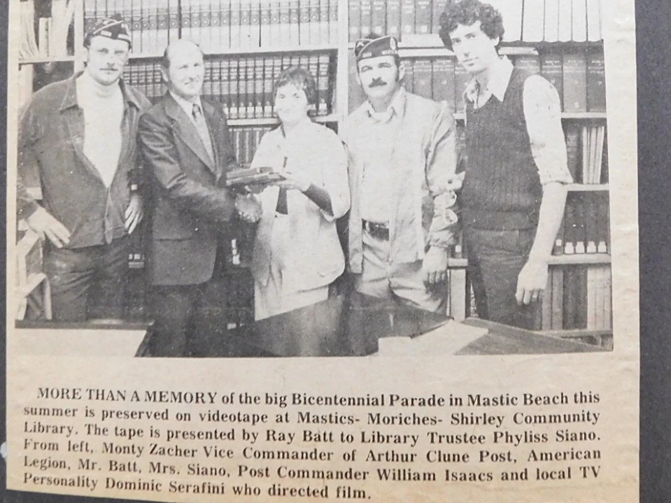 The bicentennial parade (described by the national daily Newsday as the best parade since the time of the American Revolution) had been organized by the American Legion, the national U.S. association of war veterans. The video of the parade that I recorded was later donated by the association and preserved at the Mastic–Moriches–Shirley Community Library. The video was part of my television program Made in Italy, which aired weekly on the Suffolk Cablevision channel of Viacom (now Paramount), and complemented my radio programs on WSUF-AM, WLIX-AM, and WBAB AM and FM.