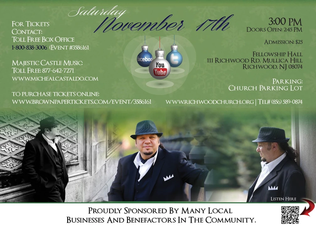 Concert Presenters Caterina and Vernon Dawson state, “Michéal Castaldo is the perfect way to move the Christmas spirit and holiday mood into your heart and home. We’ve had the privilege to hear Michéal in concert and the honor to have him sing at a personal life-changing event, our mother's funeral. Please join us in what will be the most spectacular voice you will ever hear live. Thank you for coming to our church in southern NJ.”