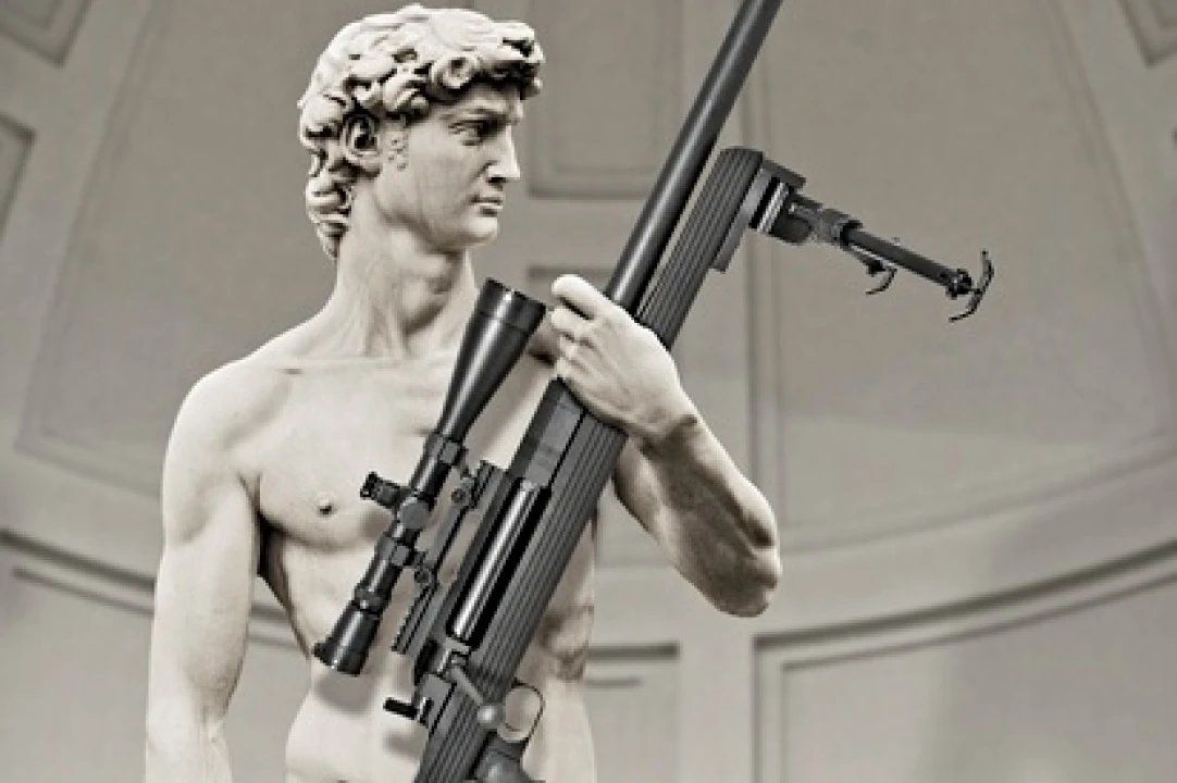 To the horror of many in the Italian cultural establishment, the world-famous marble statue has been pictured in an advertisement cradling not a slingshot but an American-made rifle.