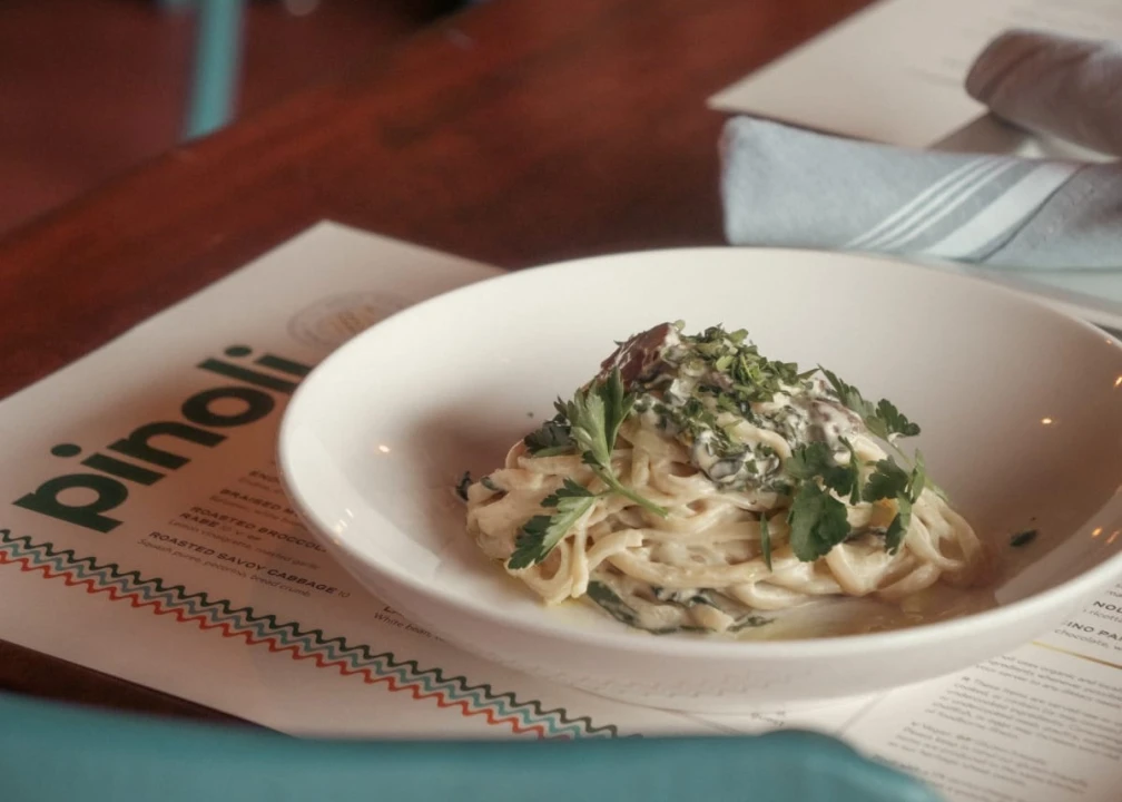 The menu at Pinoli features an array of appetizers, pasta dishes, pizzas, and main dishes. Pizzas, such as the "Fisherman's" topped with marinated seafood and the "Mortadella" topped with pistachio, parmesan and truffle stracciatella, range from $16-$22.