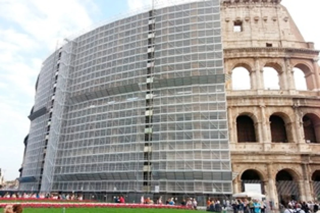 The Colosseum under scaffolding. The Trevi fountain under scaffolding. Piazza di Spagna, the pyramid of G. Cestius, and other monumental sites under scaffolding.