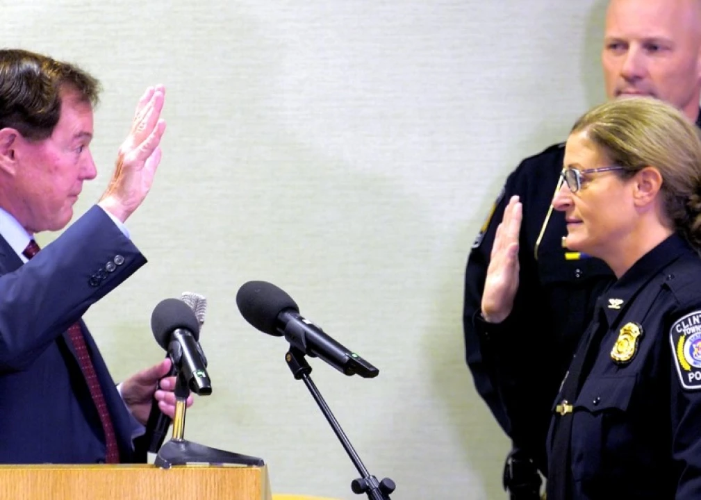 Clinton Township officials held a ceremony Thursday to formally swear in the next police chief and two command officers for the police department. With a standing room-only crowd watching from a conference room in the Clinton-Macomb Public Library, the township welcomed new Chief Dina Caringi. Also promoted were police Capt. Anthony Coppola and Lt. Michael Vasilovski
