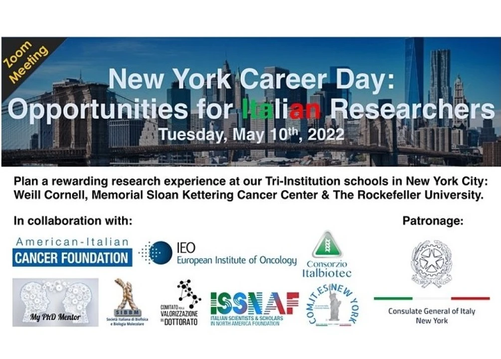 Tuesday, May 10, 2022. 3:00 PM – 6:00 PM CEST. Online event. Register here. This event is co-organized by Memorial Sloan Kettering Cancer Center, Weill Cornell Medicine, and The Rockefeller University in New York (The Tri-Institutions, or “Tri-I”), partnering with Associazione Internazionale Ricercatori Italiani (AIRI) New York Chapter and under the patronage of the Italian Consulate in New York.