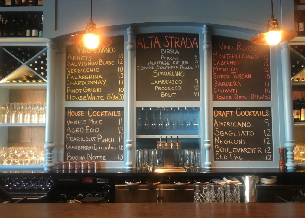 A rustic elegance embraces you at Alta Strada from the ornate chandeliers and exposed brick to the antipasto rimmed bloody mary.