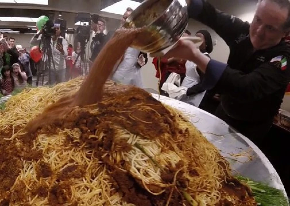 WGNO News with a Twist features guy Wild Bill Wood is at the Hilton Riverside in New Orleans where there's a big parade for the what will be the World's Biggest Bowl of Pasta. It's the yearly creation of New York Chef David Greco. Chef David Greco even brings his own cooking utensils to make this big bowl of spaghetti.