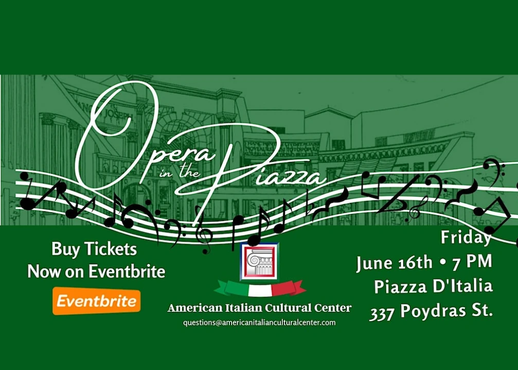 Friday, June 16 · 7 - 10pm CDT - Piazza d'Italia 377 Poydras Street New Orleans, LA 70130. Opera in the Piazza is presented by the American Italian Cultural Center. Performances arranged and directed by Todd Simmons, former Director of the New Orleans Opera Association, and current General Manager of the Jefferson Performing Arts Center.