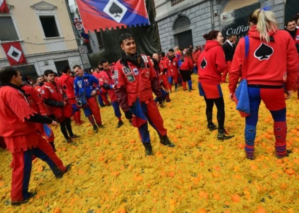 The juicy battle in Ivrea is part of the town's yearly carnival, which recreates a centuries-old revolt by commoners against the monarchy. The three-day carnival kicked off Sunday and ends the day before Ash on Wednesday, the first day of Lent in the Christian calendar.