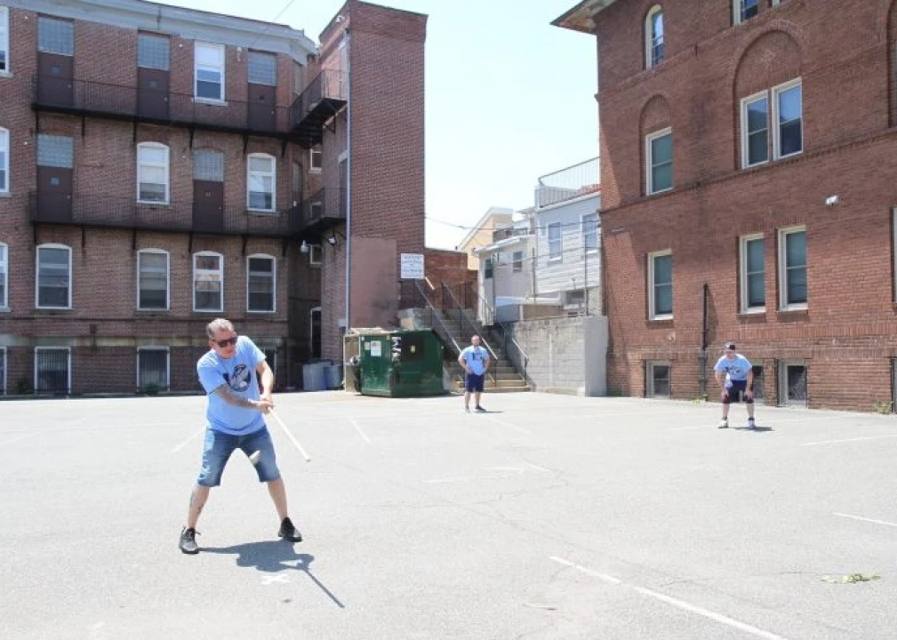 Split into teams of five people, these men comprised the 10th annual John Marzano Half-Ball Tournament, hosted at the Christopher Columbus Charter School parking lot. Marzano was a major league catcher who died after a fall in 2008. Before he played for the Boston Red Sox, Texas Rangers, and Seattle Mariners, Marzano grew up in South Philly playing half-ball. Organizers said the tournament is part-fundraiser (to support youth baseball), part-awareness campaign for the old-school street game.