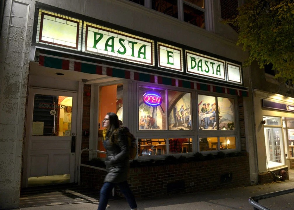 Pasta e Basta is an Amherst restaurant with two personalities. The first floor is given over to a casual pizzeria space where one orders at the counter, while the second and third floors are set up for bistro-style dining. Those upper floors also feature an open kitchen where one can watch the culinary goings-on; both also offer tables with fine views of Amherst's college-town streetscape.