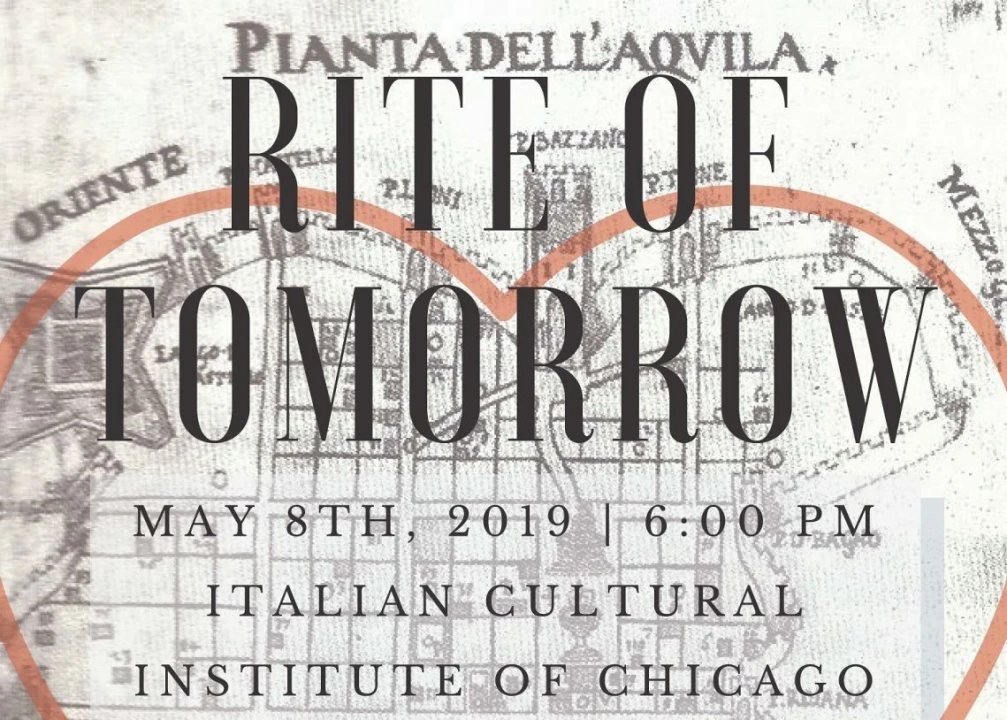 Wednesday, May 8, 2019 from 6:00 PM – 8:00 PM. Italian Cultural Institute, 500 N Michigan Ave, Suite 1450, Chicago (IL). "Rite of Tomorrow," a performance featuring Natalja Aicardi, Daniel Johanson, Roberta Terche Nocentini. In remembrance of the devastating earthquake that struck near the city of L'Aquila in 2009, affecting more than 45 towns, killing 308 people, injuring 1.600, and forcing more than 65.000 inhabitants to leave their homes.