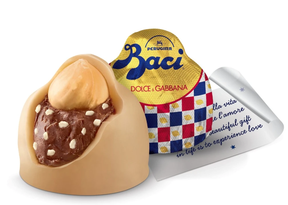 Baci Perugina announced the collaboration with Dolce & Gabbana as a celebration of Italian excellence. The new praline, called Dolce Vita, has been created by master chocolatiers working with Dolce & Gabbana. Perugina describes the result as a soft gianduia heart, with fresh lemon-flavored grains, and the crunchy whole hazelnut, all wrapped in sublime white chocolate with hints of vanilla. Dolce Vita is a “journey into the codes, scents, and colors of the Italian soul”.