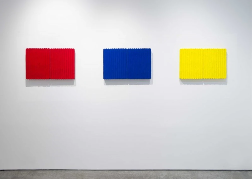 PITTURA”, an exhibition of works by Italian painter Pino Pinelli is on view at De Buck Gallery, New York. “PITTURA” features 10 site-specific artworks by Pinelli. Through the innovative use of materials and formal experiments, the artist’s works explore the essence of painting itself. Pinelli’s practice consists of mixed-media geometric forms that mimic outlines or geometric trails.