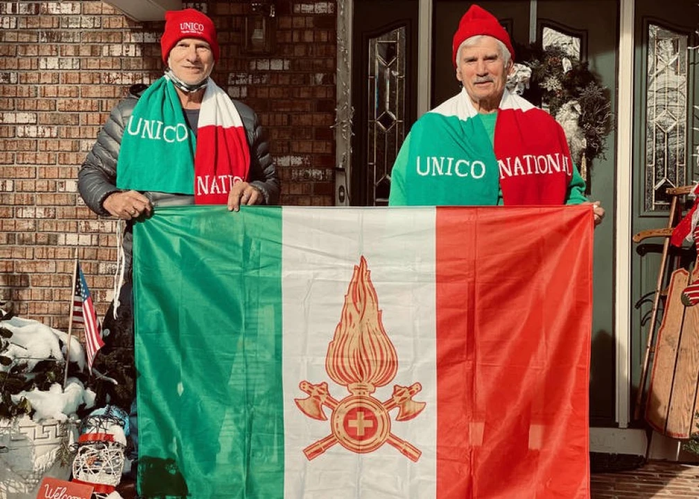 Plainfields' UNICO President Bob Bengivenga (Right) and New Jersey District X Governor Anthony Bengivenga (Left) send their virtual greeting to the regional volunteer firefighters in Bergamo province in Italy known as the "Vigili Del Fuoco Isole Bergamasca", whose commander is Luigi Mandelli.