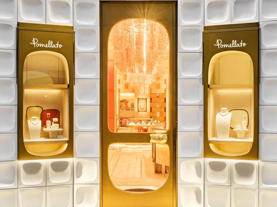 To walk through the glowing bronze doors of Pomellato's new Rodeo Drive flagship boutique is to be fully immersed in the Italian jeweler’s long legacy, with references both direct and subtle. These details begin before shoppers even enter the store—from an oversized brass door handle, intentionally molded to resemble Pomellato's Iconica ring, to a storefront covered in white tiles, shaped by Fornace Sant’Anselmo to mimic the brand’s Nudo jewels.
