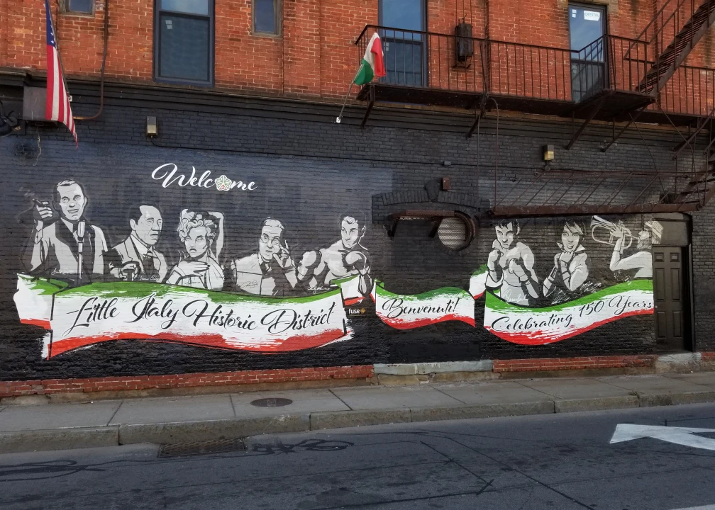 The Little Italy Wall Mural was originally designed by Domenico Colaprete of FUSE Creative on Lyell Avenue and members of the Little Italy Association of Rochester, and then it was installed on the Flat Iron building by Fuse Creative. Mural paid for by Silvano Orsi and Thomas LaBue. (the owner of the Flat Iron building).