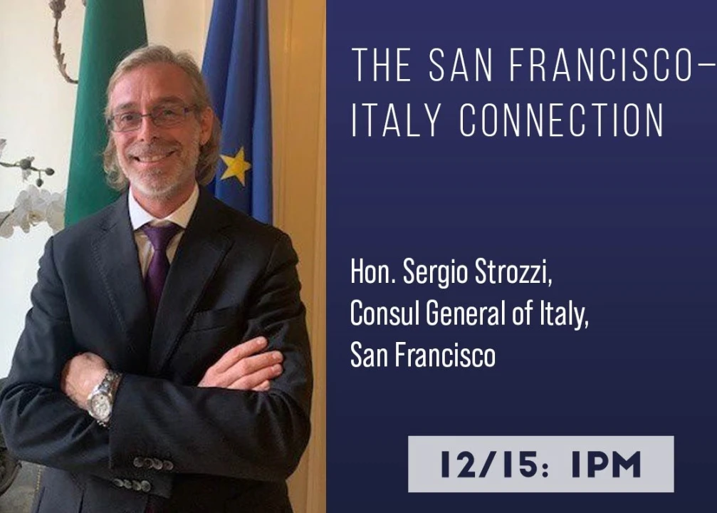 Thursday December 15 @ 1:00 PM - 2:00 PM. Organized by Il Cenacolo Italian Cultural Club - SF Italian Athletic Club, 1630 Stockton Street - San Francisco, CA. Hon. Sergio Strozzi, Consul General of the Republic of Italy in San Francisco, will discuss the special relationship between Italy and San Francisco—through art, music, food, wine, and families.