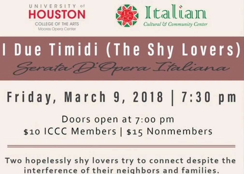 Serata d'Opera Italiana - I Due Timidi (The Shy Lovers). Friday, March 9, 2018 at 7:30 pm. Italian Cultural & Community Center - 1101 Milford - Houston, TX 77006. Cost: $10 ICCC members | $15 non-members. Reserve today - Eventbrite or call 713-524-4222 ext. 7. Want more information? Click here.
