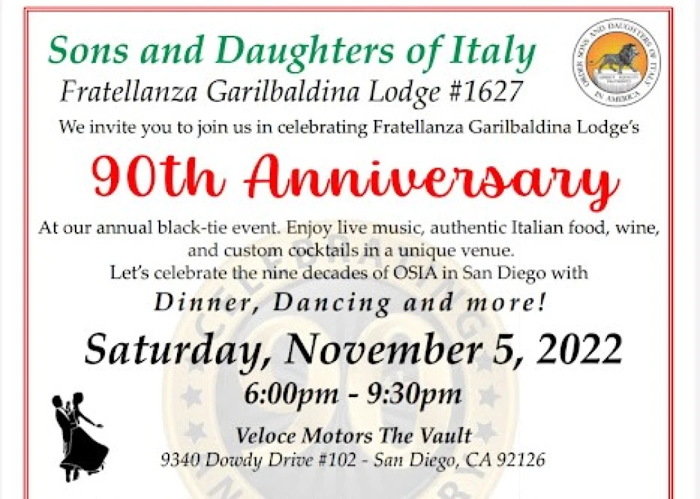 Hey friends and family!! I need you to help us celebrate our 90th Anniversary! With the great entertainer Frank DiSalvo, an awesome venue (Veloce Motors The Vault - Miramar ), and great food, this will be a dinner dance and party you'll never forget! Italian Style! Celebrating the 90th Year Anniversary of the Sons of Italy San Diego- Lodge No. 1627 !! Saturday, November 5th, 2022, 6:00 pm to 9:30 pm.