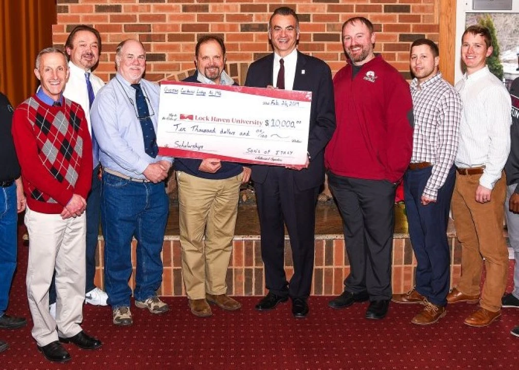 The Sons of Italy Loggia Giosue Carducci Lodge No. 146 presented a check for $10,000 to Lock Haven University recently. The programs supported by the gift are wrestling, $1,000; men’s and women’s soccer, $2,000; Capt. Andrew Koss ROTC Memorial Scholarship, $2,500; football, $2,500; and the Student Retention Fund, $2,000.
