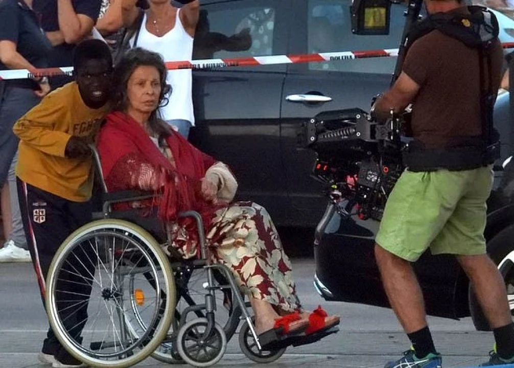 On Wednesday the 84-year-old acting vet was seen in character as her chair was pushed by a young boy while filming in Bari, Italy. Sophia had no makeup on and her hair was under-styled. But her outfit was bright and cheerful with a red shawl and a red-and-white floral skirt. Her red shoes tied in nicely. A young boy in a yellow top and black sweatpants pushed her across the street.