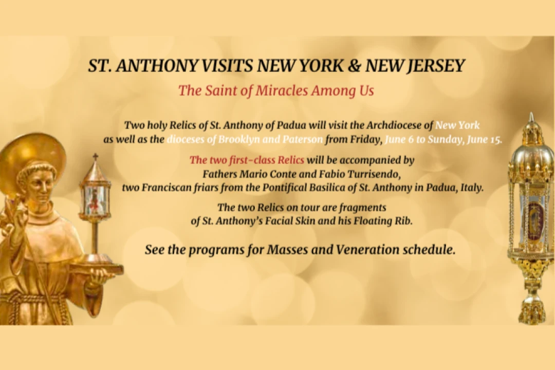 Two Holy Relics of St. Anthony of Padua will visit the Archdiocese of New York as well as the dioceses of Brooklyn and Paterson from Friday, June 6 to Sunday, June 15. The two first-class Relics will be accompanied by Fathers Mario Conte and Fabio Turrisendo, two Franciscan friars from the Pontifical Basilica of St. Anthony in Padua, Italy.