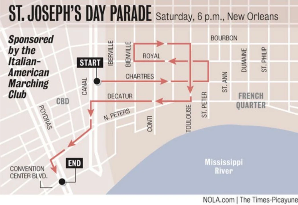 The Italian-American Marching Club's St. Joseph's Day Parade is Saturday, March 9, starting at 6 p.m. at Chartres and Canal streets. The parade marches through the French Quarter and Central Business District, with men passing out flowers in exchange for kisses or throwing beads from the new Rolling Cannoli float. After the parade, which ends on Convention Center Boulevard, the Club will host its Muffaletta Dance at the Hilton Riverside Hotel, starting at 9 p.m. and featuring music by Louisiana Spice. This is the first year that the dance is open to the public, and admission is $40.