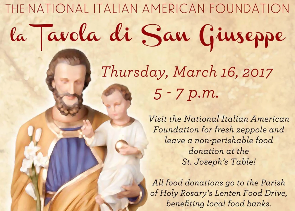 Join NIAF for our St. Joseph’s Table Open House, Thursday, March 16, from 5 to 7 p.m., at NIAF Headquarters, at the Ambassador Peter F. Secchia Building, 1860 19th St. NW, Washington, D.C.