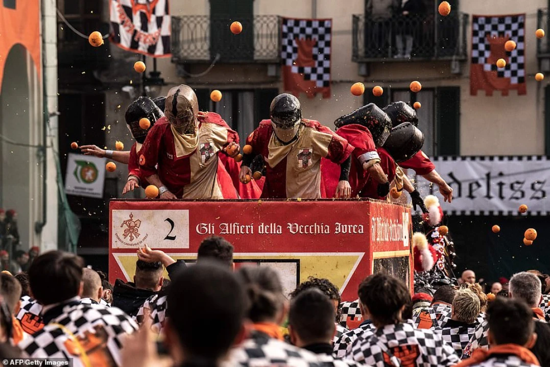 The annual Battle of the Oranges has taken place in Italy with teams pelting each other with fruit during the three-day festival. The tradition's origins are unclear but it is believed it dates back centuries. Hundreds of people attend the event in Ivrea, a town in northern Italy near Turin. It supposedly commemorates a 12th century uprising with oranges representing the head of their enemy.