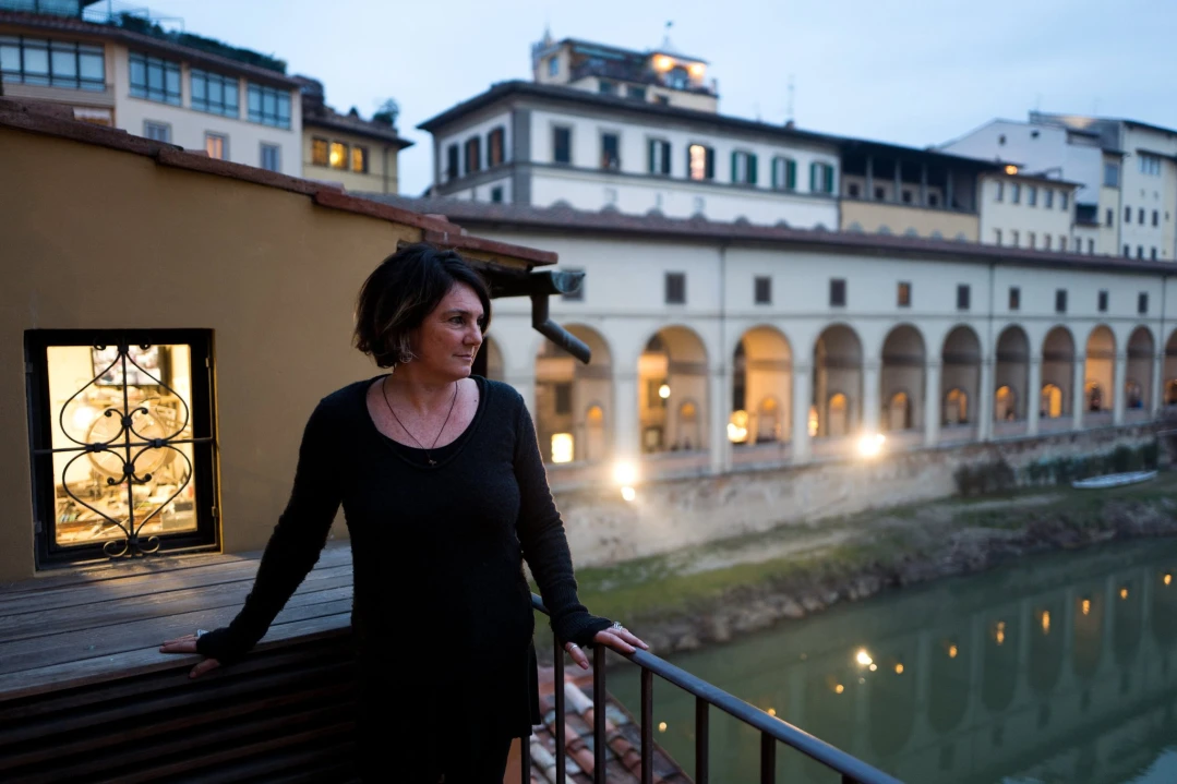 Through a shop door and up three flights of narrow stairs, beneath ceilings that are lower the higher you go, is a room with a worn wooden workbench facing a window. From there, the last craftswoman still occupied making jewelry on the bridge where goldsmiths have plied their trade for five centuries has maybe the most enthralling of Florentine vistas all to herself.
