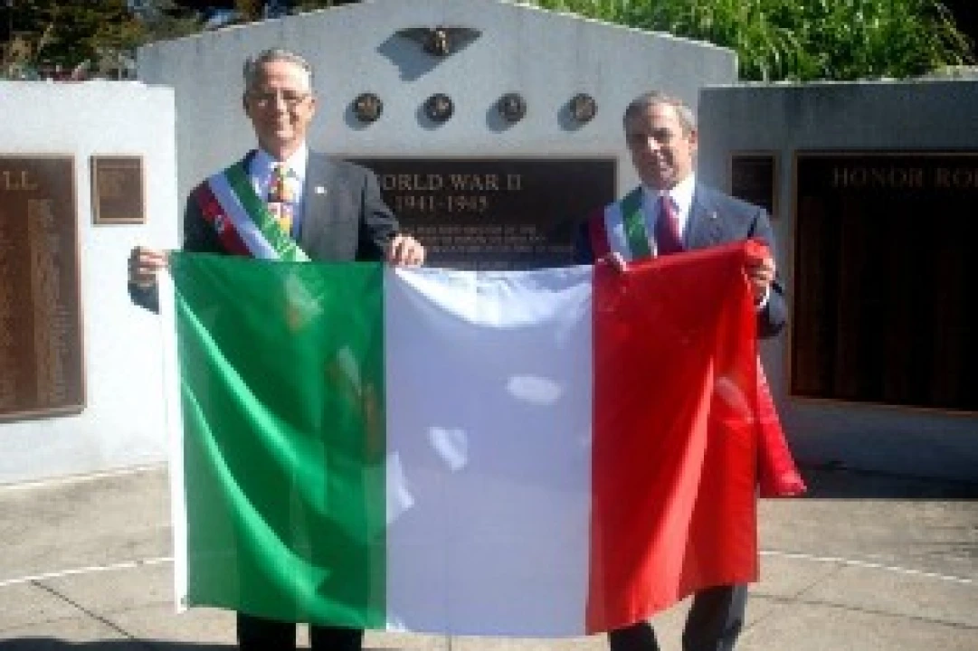 Pictured is North Haven First Selectman, Michael Freda as he "passes" the Italian Flag to East Haven Mayor, Joseph Maturo, Jr. in recognition of theTown of East Haven becoming the host community for the 2015 Columbus Day Parade.