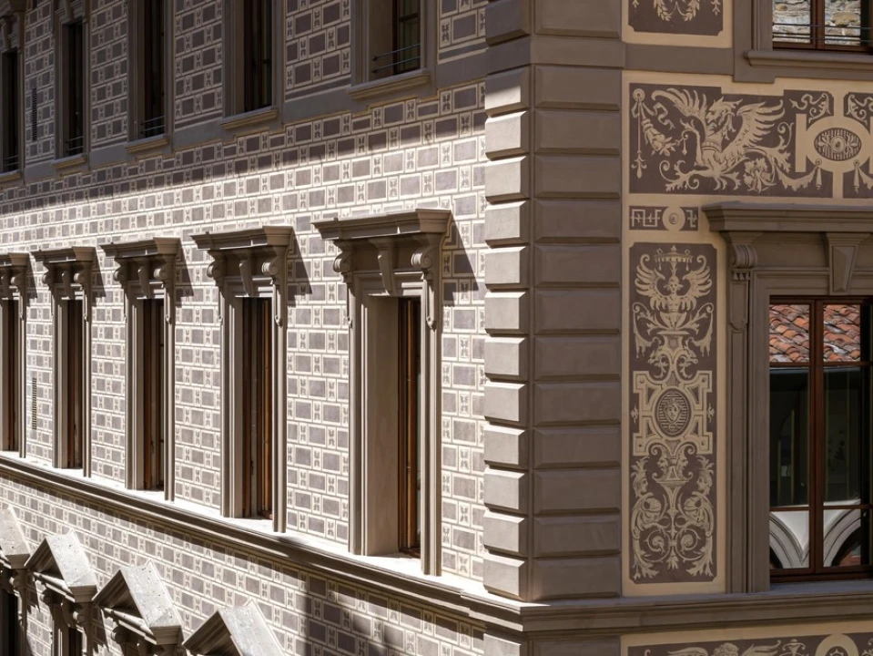 Before the stucco-like material sets, an artist uses a pointed element to carve detailed outlines, geometric designs, frieze motifs and other embellishments into a building façade, lending it depth and texture, while creating a strong contrast between light and dark (commonly referred to as chiaroscuro).