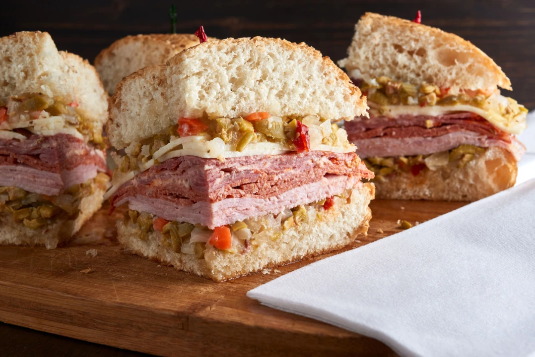 The 115-year-old shop hasn’t changed, and the muffuletta has been sliced and carved the exact same way for a century. The sandwich traditionally consists of a muffuletta loaf split horizontally and covered with layers of marinated olive salad, salami, ham, Swiss cheese, provolone, and mortadella.