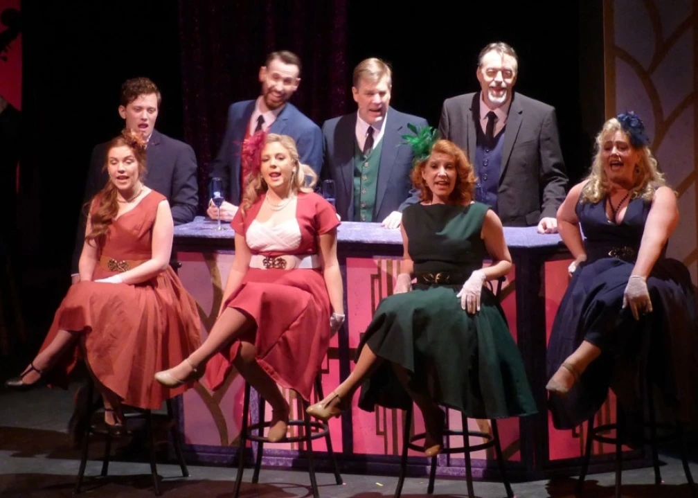 Tacoma Musical Playhouse continues its 2017-18 season with “My Way: A Musical Tribute to Frank Sinatra,” which functions as the playhouse’s romantic Valentine’s show, featuring a bounty of songs about love and romance. The cast of eight singer/actors are backed up by a live band on stage: Jeffrey Stvrtecky on piano, Jessie Kuras on string bass and Iris McBride on drums. Behind the band is an understated backdrop consisting of the silhouettes of skyscrapers. The rest of the background can be lit with a variety of brooding hues and projected effects (such as a beautiful big, full moon.)