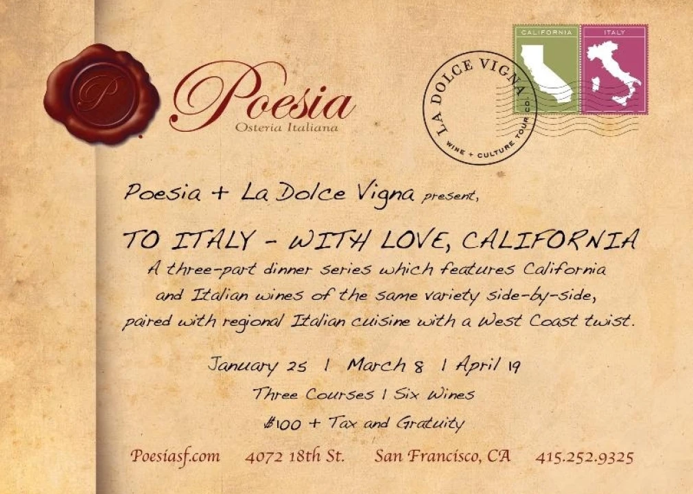 March 8 & April 19 - To Italy - With Love, California. A series of three dinners organized by La Dolce Vigna for Poesia Osteria which feature California and Italian wines of the same variety side by side, paired with regional Italian cuisine with a West Coast twist.