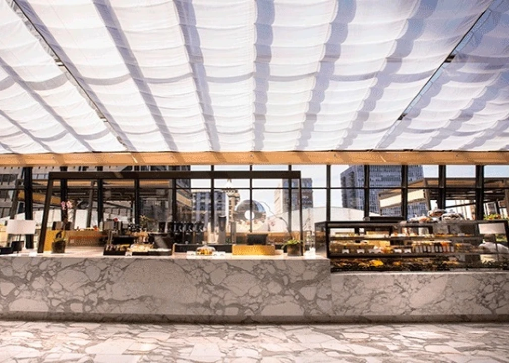 The design incorporates oversized plush booths, fine Italian leather, and ornate white Italian marble throughout the dining room. Light woods, blue upholstery, and custom brass and globe lighting installations tie the space together for a clean aesthetic.
