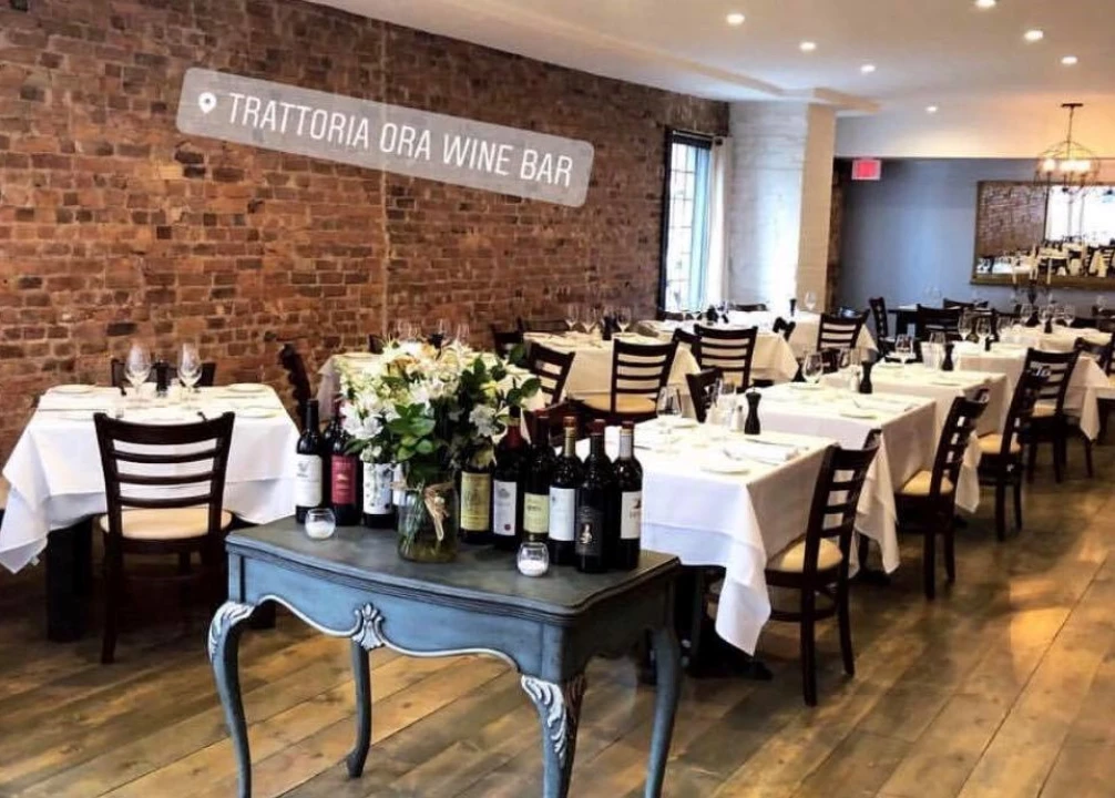 Trattoria Ora and Wine Bar is a gem of a restaurant, tucked away on a quiet, picturesque corner of Astoria Blvd. and 18th Street, where the warm glow from inside and outside this cozy restaurant can be seen from a distance. The rustic, romantic dining room resembles a farmhouse with exposed brick, soft lighting, an inviting bar, and a long, communal table at the rear that seats 10 for family meals and gatherings of friends. An antique mirror and a beautiful clock grace the wall in this beautifully appointed private area.