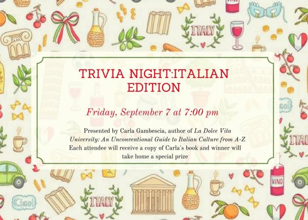 Trivia Night: Italian Edition! September 7 (Friday) 7:00 pm - Westchester Italian Cultural Center. One Generoso Pope Place, Tuckahoe, NY. Admission: Members $30; Non-Members $35. Contact: Lindsay Brewster 914-771-8700 [email protected]
