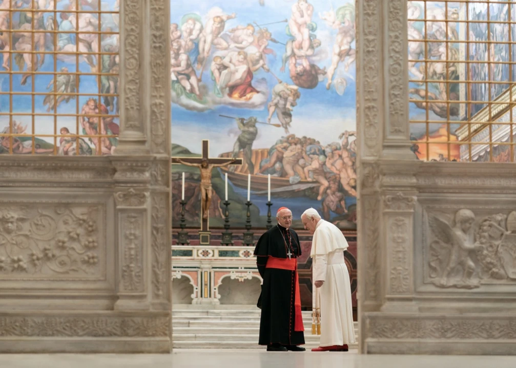 Though vastly different from each other in papal approach, they find common ground in the Sistine Chapel. They chat while traversing the Vatican City landmark; they jointly admire Michelangelo’s masterful frescoes. They forgive and pray for each other, and even share a pizza in a small, private room.