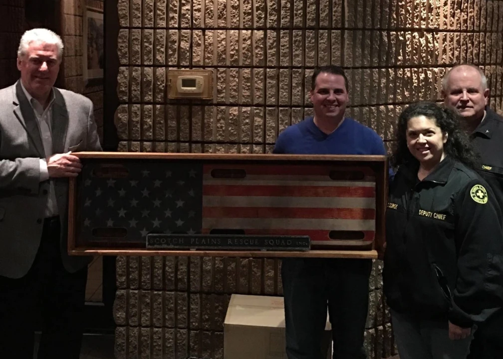 At its annual meeting on Tuesday, March 28, UNICO, the Italian American service organization, made a special donation to the Scotch Plains Rescue Squad #scotchplainsrescuesquad at Giovanna's in Plainfield. The flag artwork was created by Ernie Hernandez in honor of the squad's 80th anniversary this year. Hernandez, a recently retired Scotch Plains police officer, served on the Rescue Squad for decades. He created the piece from old wooden backboard from one of the squad's original ambulances.