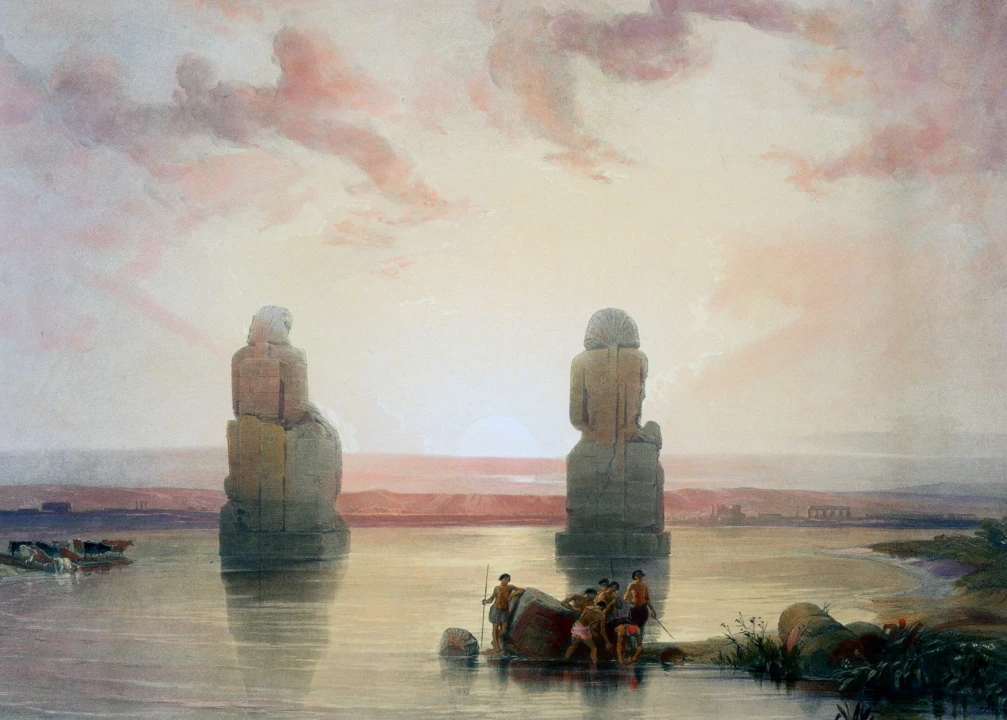Deep in the south of Egypt, on the west bank of the Nile facing the historic capital Thebes, stand two 60-foot-tall statues of the pharaoh Amenhotep III (14th century BCE). By the time the Romans annexed Egypt in 30 BCE, these colossi were an ancient remnant of the grandeur of the pharaoh’s mortuary temple, doomed by the Nile’s floodwaters, that they had once fronted.
