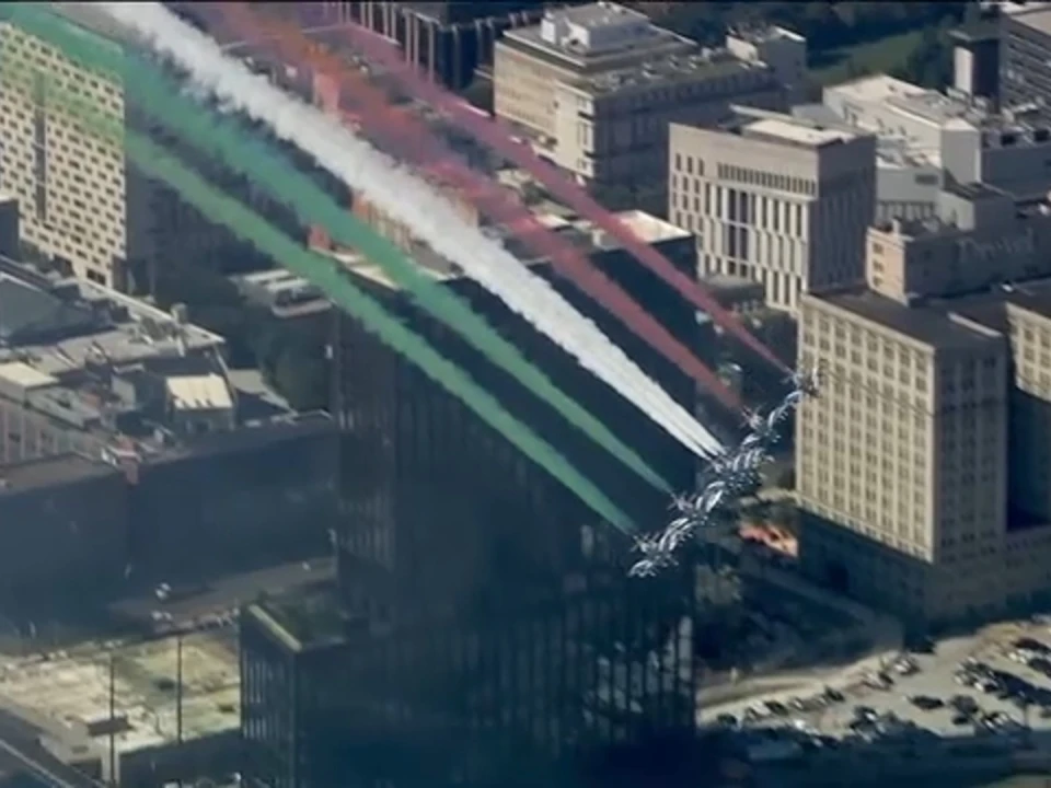 It was a colorful display to start Monday morning in Philadelphia, courtesy of the Italian Air Force. The famous Frecce Tricolori flew over the city in a 10-jet formation with their signature red, white and green smoke trails.