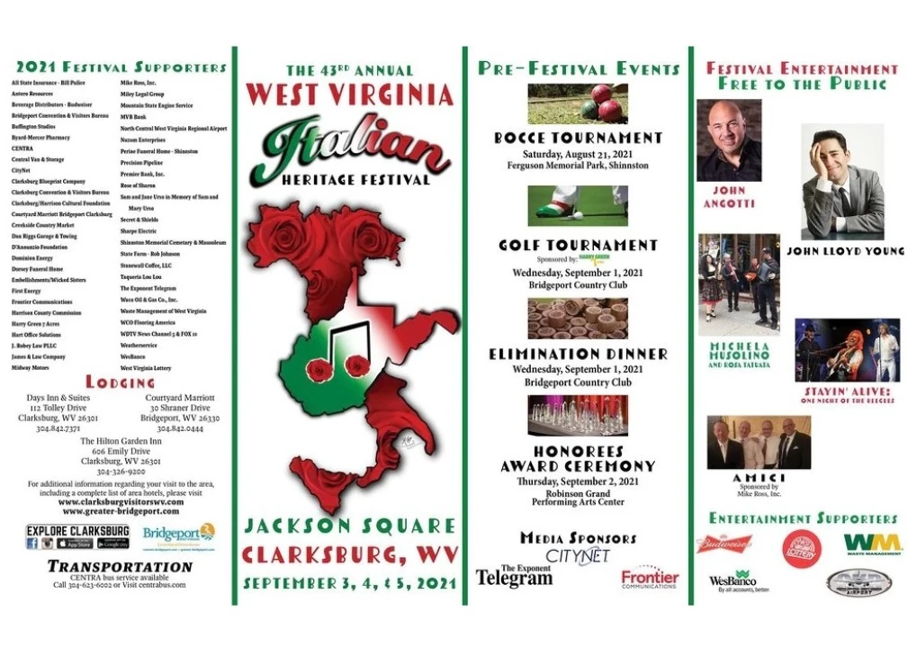 The 43rd annual West Virginia Italian Heritage Festival is coming soon! The festival will be held at Jackson Square in Clarksburg, WV from September 3-5th. Some pre-festival events are also happening. On September 1 there will be a golf tournament and an Elimination Dinner at Bridgeport County Club.