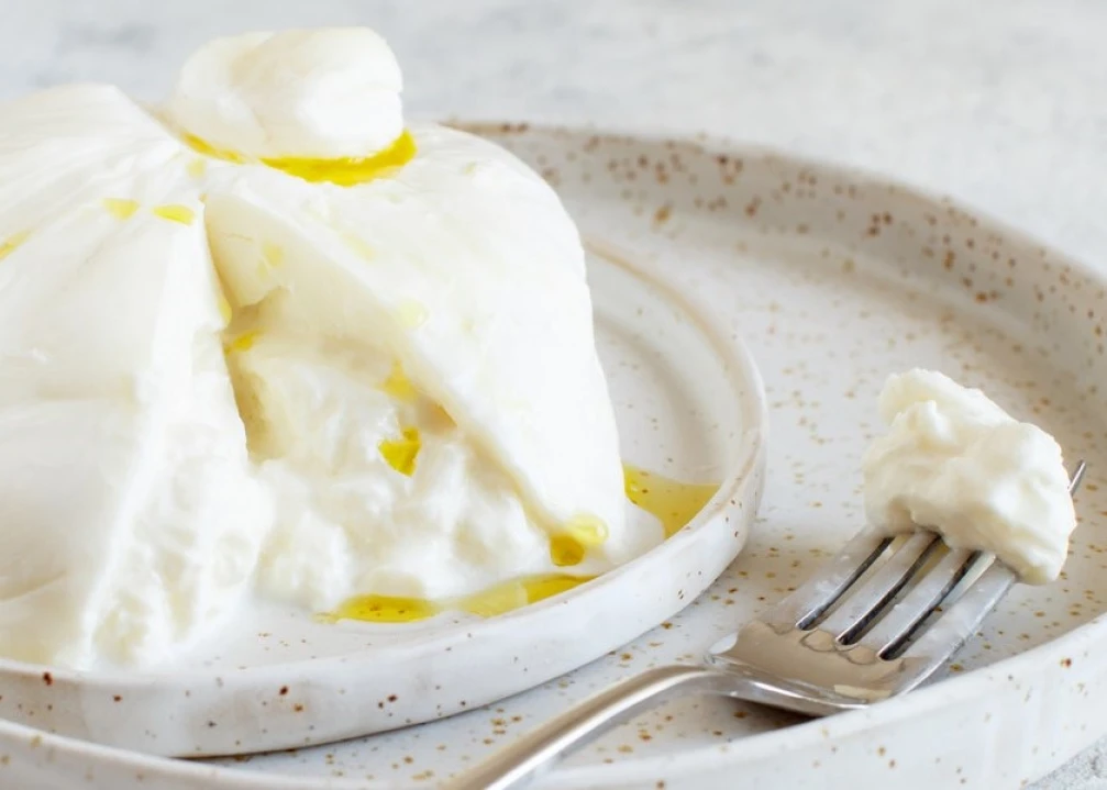 But while mozzarella, also known as fior di latte, has been produced in Campania since the 12th century, burrata was first produced in Andria, Puglia, invented by Lorenzo Bianchino in 1956. A heavy snowfall rendered the transport of dairy products difficult, so the cheesemaker decided to use the stretched curd from mozzarella as a casing to store the cream. And so burrata was born.