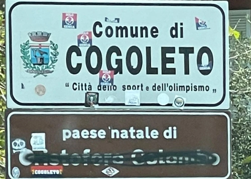 In early August a dear friend traveling to Liguria sent me a photo, taken by him. While driving he had seen a sign that had attracted his curiosity, and he knew well that it would interest me as well. The photo is the one you see here: Cogoleto, the small town where Christopher Columbus was born has a sign announcing this important fact, but someone thought to vandalize it, canceling the name of Christopher Columbus. It is, quite literally, the concept of cancel culture, which affected Columbus in America and is now beginning to affect him here in Italy as well, indeed in his very town of birth.