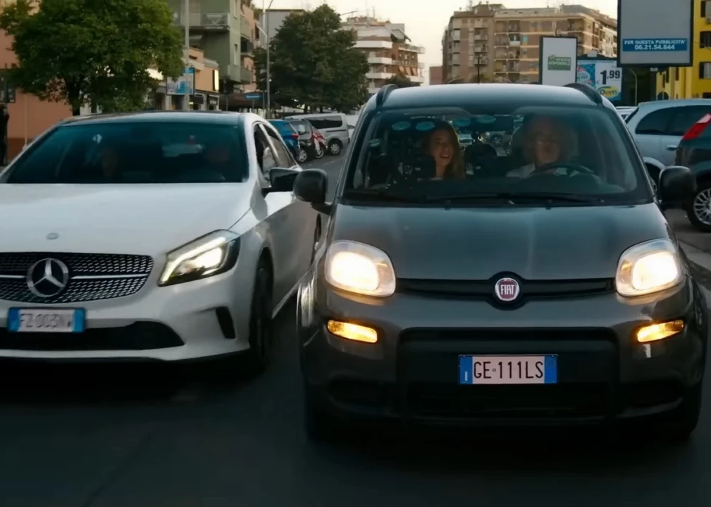 Although she insists on driving him to Rome, she does hand him the wheel of their Fiat Panda once there. When he finally takes the wheel, it’s rather surprising. May is completely transformed from Captain Slow into Captain Aggro and almost immediately takes off flying, causing Scognamiglio to wince with panic. She squirms in her seat just like a parent teaching their child to drive, and it may ultimately be as a result of May’s expectations of the city.