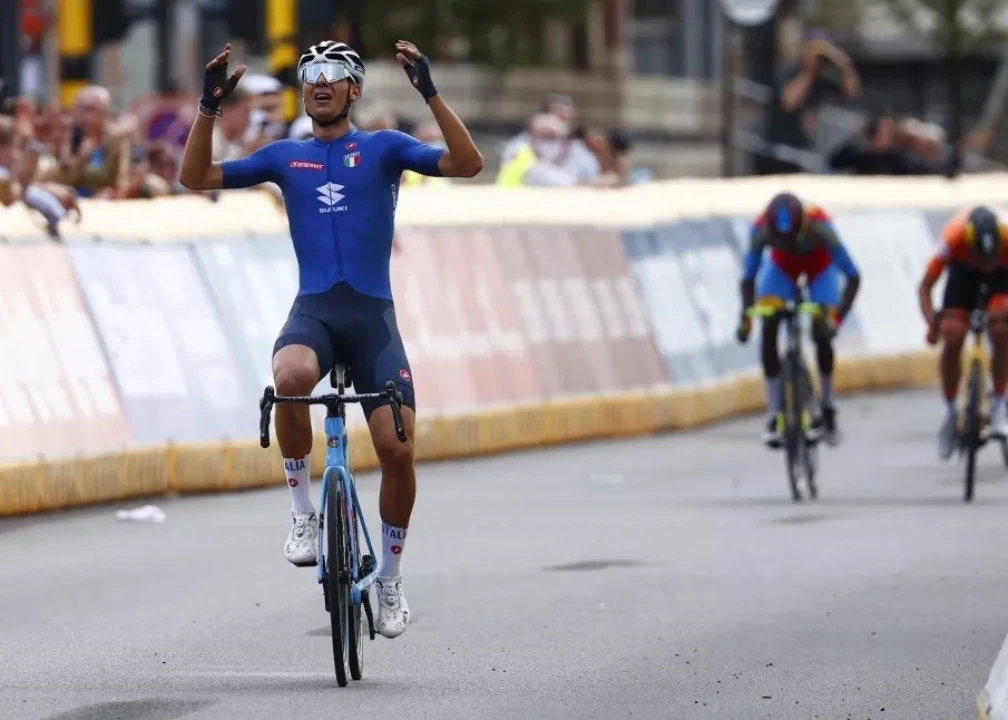Biniam Girmay won the sprint from a reduced bunch to take silver, an unprecedented result for his native Eritrea, while Olav Kooij (Netherlands), finished just behind to take bronze. Baroncini stormed out of the peloton on the Wjinpers with an acceleration that nobody could match.