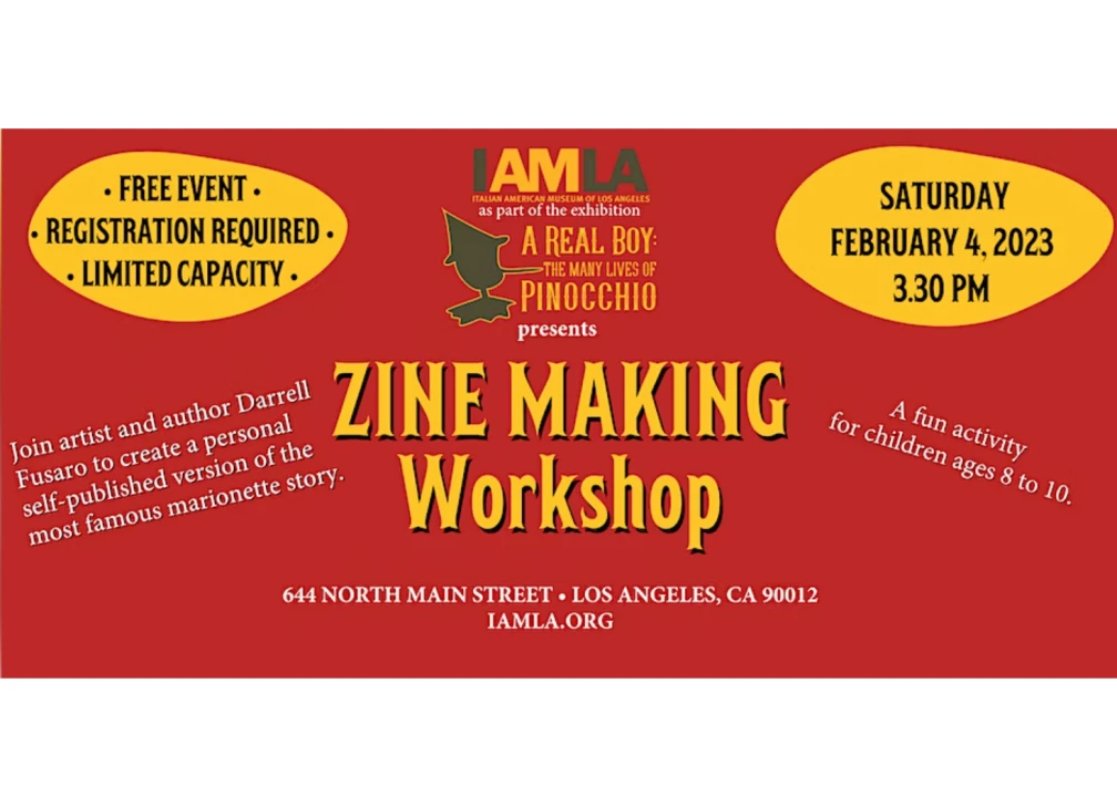 A Free Zine Making Workshop celebrating Pinocchio, led by artist and author Darrell Fusaro. Saturday, February 4, 2023, 3:30 PM – 5:00 PM PST. The Italian American Museum of Los Angeles 644 North Main Street Los Angeles, CA 90012. As part of the exhibition "A Real Boy: The Many Lives of Pinocchio", the IAMLA presents a free and engaging workshop led by artist and author Darrell Fusaro.
